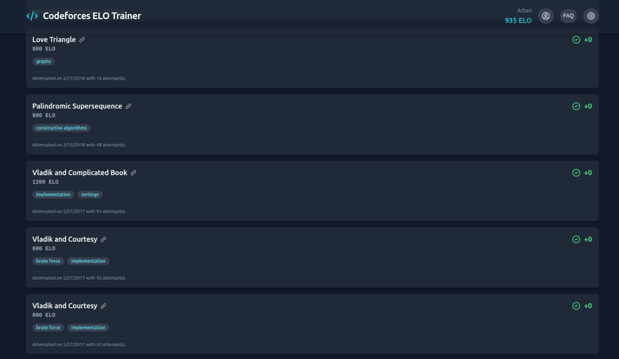 It can take in your codeforces username, and then keep suggesting you problems based on your past attempted problems and your ELO. It also has the full history of your past submissions right in the same page so you can reflect on what type of problems you have spent the most on and where else you can put your efforts into. It follows the standard chess ELO system. So depending on if you could solve a problem or not, how difficult it was, and what your current ELO is, it gives you positive or negative ELO. So, I can still have that assessment of my skill level without being too much involved in the competitive nature of it.