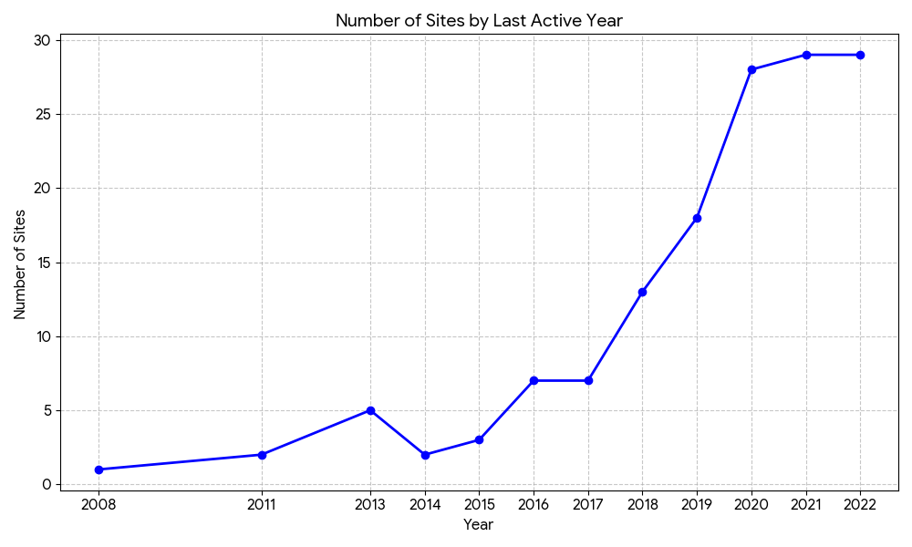 - 2022: 169 active sites, avg 5.7 posts, max 49
